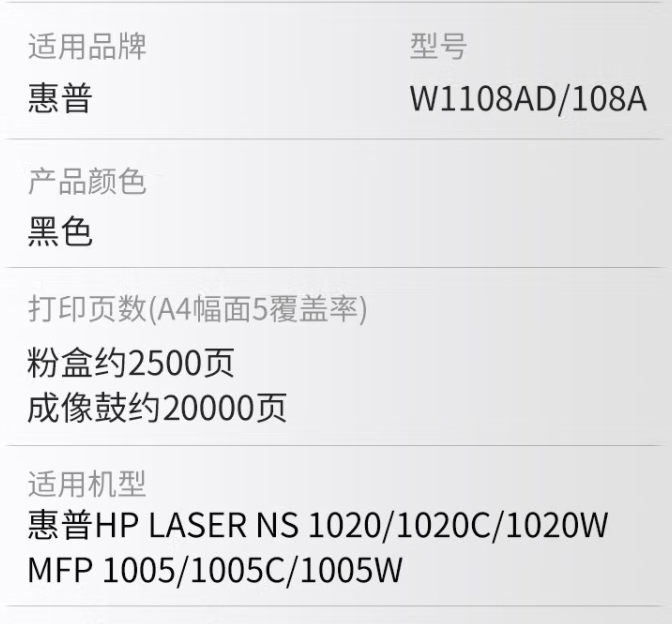 京呈適用惠普W1108AD粉盒HP108AD打印機墨盒NS1020c/w硒鼓mfp1005c/w閃充 W1108A/108A碳粉盒